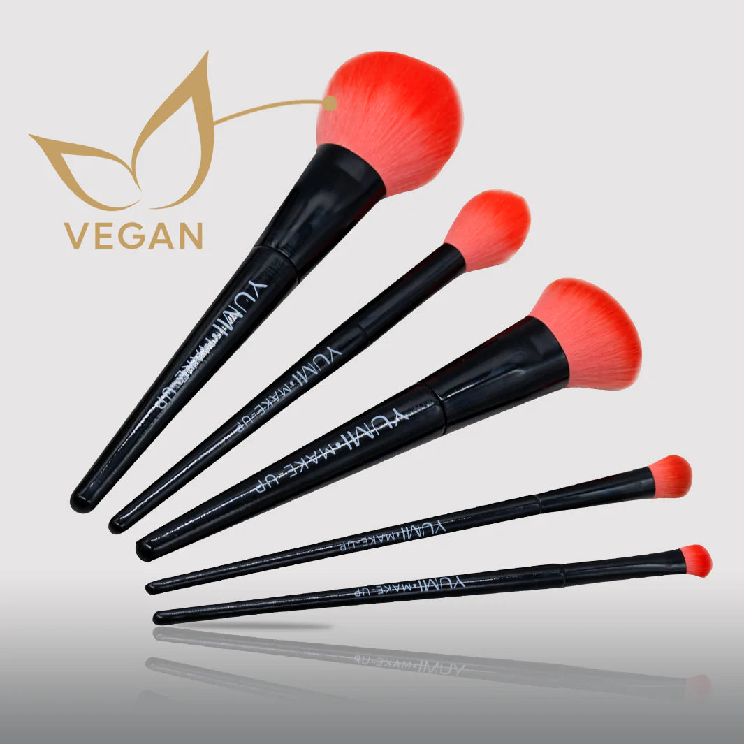 Cet écrin très élégant est composé de 5 pinceaux d'une très belle qualité pour sublimer votre regard et votre teint. Les poils sont denses et extra doux pour une application experte, lisse, précise et homogène. Grâce aux poils en fibre synthétique Vegan, on évite le gaspillage des cosmétiques et au pinceau de perdre ses poils. Manches en bois laqué.