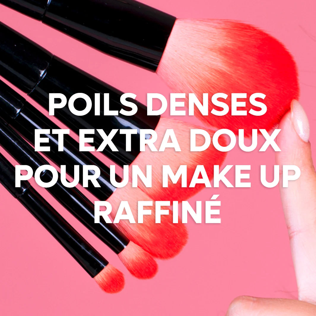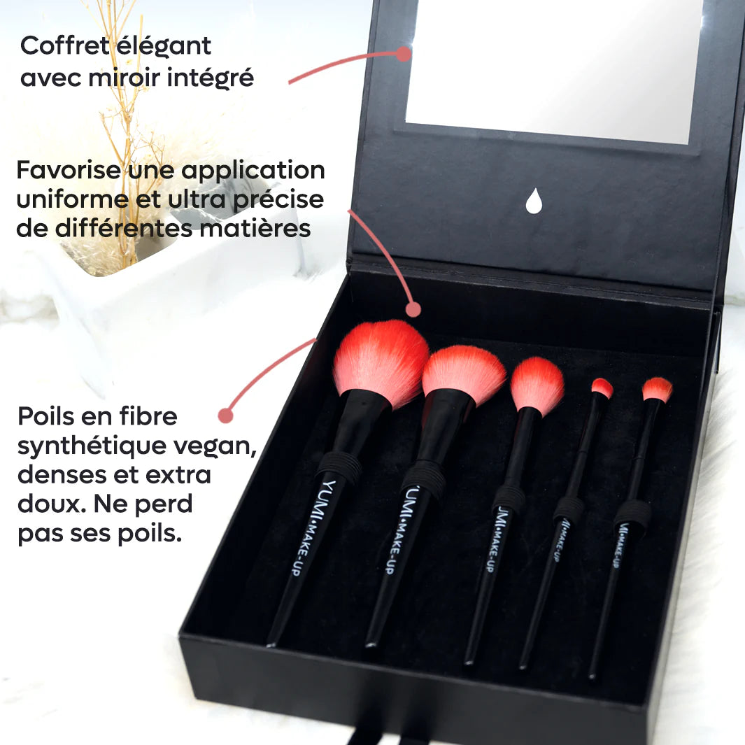 L'écrin est composé de : 1 pinceau blush arrondi + 1 pinceau blush biseauté + 1 pinceau highlighter + 1 pinceau estompeur + un pinceau ombreur plat.