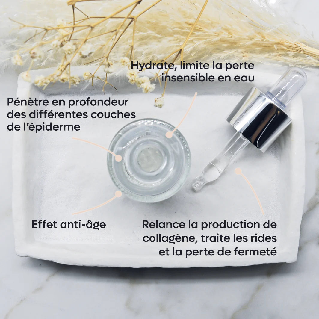 C’est un acide hyaluronique à bas poids moléculaire. En effet, 40 fois plus petit que l’acide hyaluronique à haut poids moléculaire, il pénètre plus en profondeur des différentes couches de l’épiderme. Il va relancer la production en collagène, traiter les rides et la perte de fermeté.